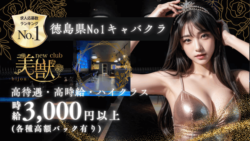 徳島エリアのキャバクラ・ラウンジ・ガールズバーなどナイトワーク求人や即日体入情報を網羅。店舗の雰囲気や待遇、働き方までリアルな情報を発信しながら、安心して稼げるナイトワーク探しをサポートします。